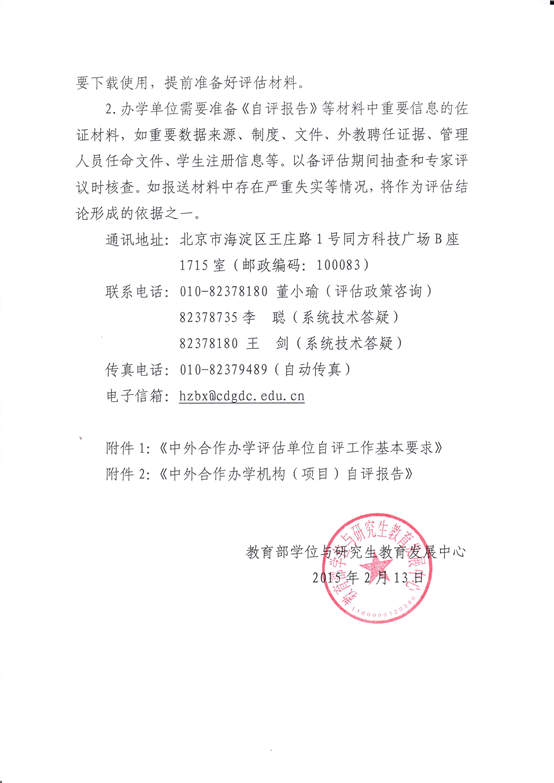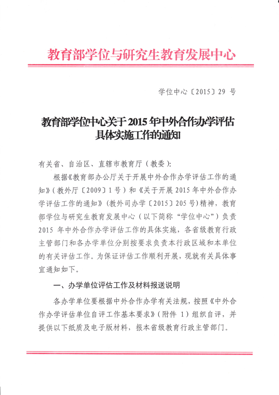 《教育部学位中心关于2015年中外合作办学评估具体实施工作的通知》(学位中心[2015]29号)