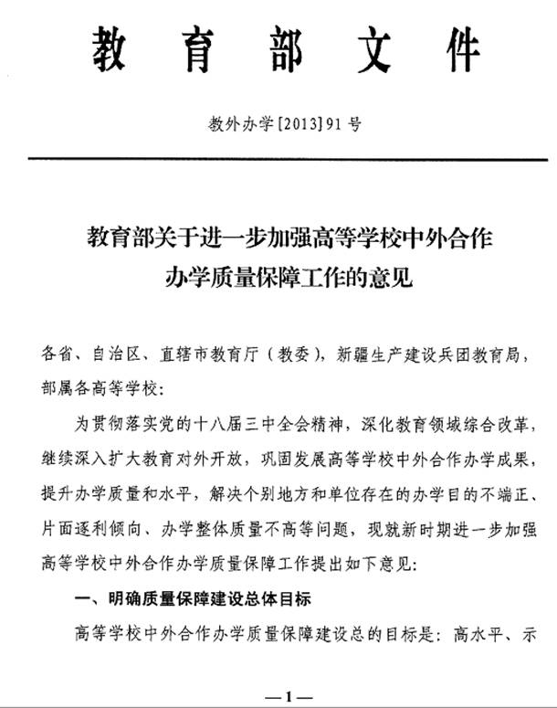 《教育部关于进一步加强高等学校中外合作办学质量保障工作的意见》(教外办学[2013]91号)